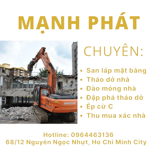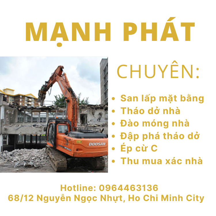 Phá Dỡ Nhà Mạnh Phát là đơn vị chuyên cung cấp dịch vụ phá dỡ nhà dân, nhà xưởng, công trình xây dựng uy tín hàng đầu tại TP.HCM và các tỉnh lân cận. Với đội ngũ thợ lành nghề, máy móc hiện đại và quy trình thi công an toàn, Mạnh Phát cam kết mang đến giải pháp phá dỡ nhanh chóng – tiết kiệm – chuyên nghiệp cho mọi khách hàng.